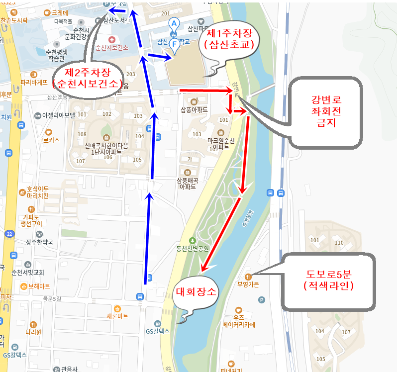 임시주차장(1,2) 접근시. 강변로 에서 주차장쪽으로 죄회전이 불가합니다. 반드시 "파란색 라인"으로 오셔야 시간낭비를 하지 않습니다.